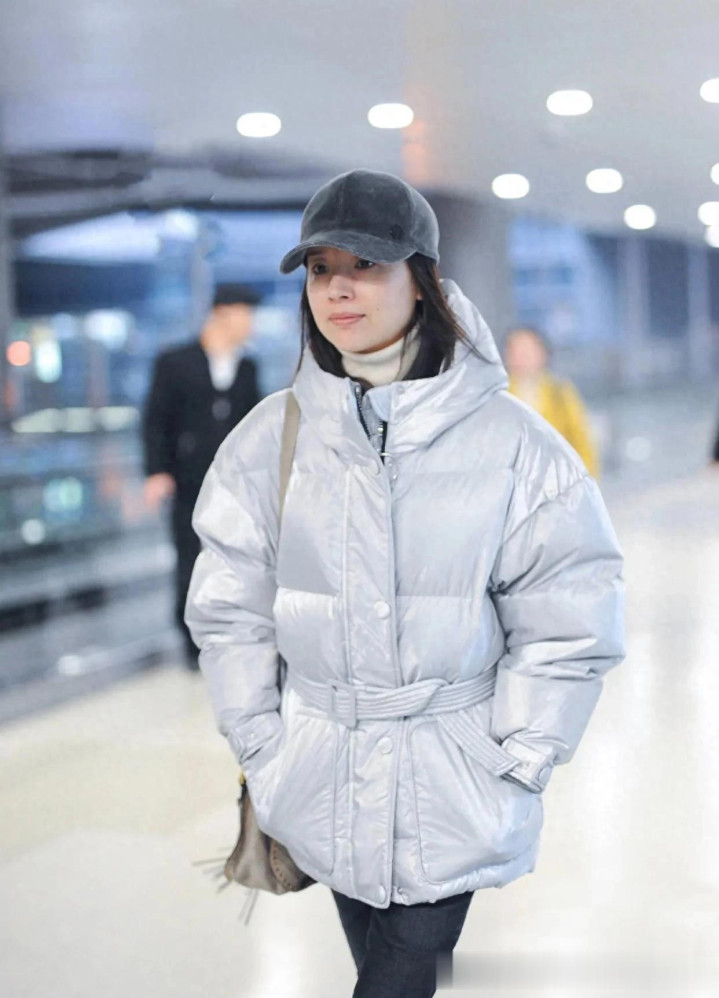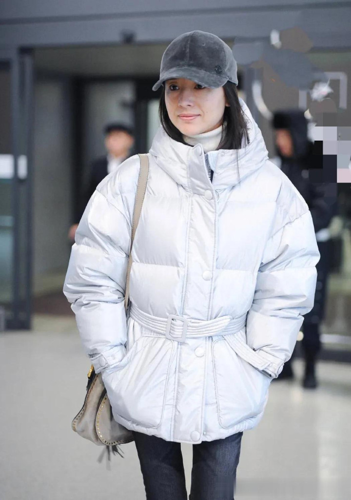 董洁机场私服真会穿! 系腰羽绒服+牛仔裤+短靴, 时髦洋气又高级!